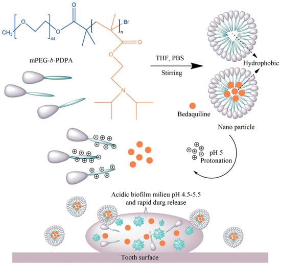 Zhang et al. (2021) used mPEG-b-PDPA to produce a pH-responsive core–shell nano micelle [44]. 2-(Diisopropylamino) ethyl methacrylate (DPA) copolymer was used to form the hydrophobic core for loading bedaquiline (a hydrophobic antibacterial agent). The loading ratio and encapsulation efficiency of bedaquiline in mPEG-b-PDPA were 37 and 92.5%, respectively. The micelles acted as a pH-responsive agent that shifted the core from hydrophobic to hydrophilic via protonation as the pH dropped below 6 (see Figure 5). This caused the swelling and disassembly of the micelles and subsequent drug release. At pH 5, the cumulative release of bedaquiline from micelles was 92.2% in 3 h, but no more than 35% was detected at pH 7 in the first 12 h. This nanocarrier not only enabled the targeted release of the therapeutic agent under acidic environments, it also improved the working concentration in the local acidic area to exert a greater antibacterial/antibiofilm effect. In the antibacterial model at pH 5, free micelles did not show an inhibitory effect against planktonic S. mutans, while the 1% bedaquiline-loaded micelles group (equivalent to ~25 μg mL–1 bedaquiline) significantly reduced the growth of S. mutans to less than 50% of the control. In addition, the live/dead staining images of the S. mutans biofilm revealed that most bacteria in the biofilm were dead (dyed red) in the 1% bedaquiline-loaded micelles group, as opposed to the massive green cells observed in the control and free micelle groups. Cytotoxicity studies using periodontal ligament stem cells showed that the micelles were not toxic, suggesting a good potential for clinical application for the treatment of dental caries.