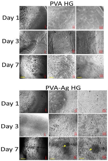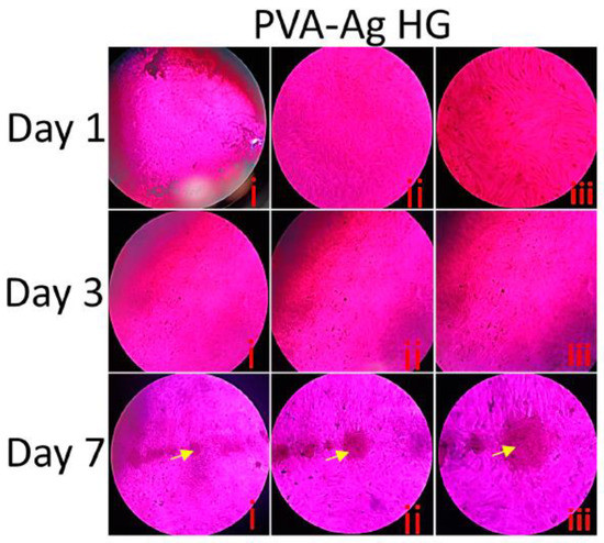 3.2. PVA and PVA-AgNPs Hydrogel’s Microstructure