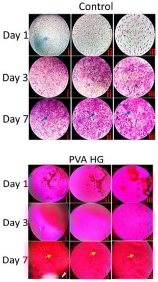 In vitro studies, such as proliferation, cytotoxicity, histological staining, and fluorescence staining, showed that the growth of the cell was superiorly supported through culturing the cells on hydrogels than the control, and the effect was more pronounced in cells cultured on AgNPs-PVA HG. Similar to the present study, earlier studies proved the proliferative effect of PVA hydrogel in MSC cell growth [15,69,70,71]. In addition, the proliferative effect of MSCs by AgNPs-PVA-HG was also reported by several researchers [72,73,74]. Similar to the present study, the in vitro responses of mesenchymal stem cells, the in vivo immunomodulatory and healing behavior of a PVA membrane containing AgNPs, and collagen and hyaluronic acid were reported by Júnior et al. [72]