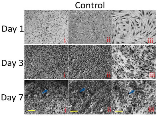 Light microscopic pictures of MSCs cultured on silver nanoparticle-loaded PVA hydrogels. PVA HG: Poly (vinyl alcohol) hydrogel; PVA-Ag HG: Poly (vinyl alcohol) hydrogel loaded with silver nanoparticles and control cells cultured without hydrogels. From left to right, different magnifications at i—4×, ii—10×, and iii—20× are shown. The scale bar corresponds to i—200 µm, ii—100 µm, and iii—50 µm. Blue and Yellow arrows show the densely populated cells and extracellular matrix deposition, respectively.