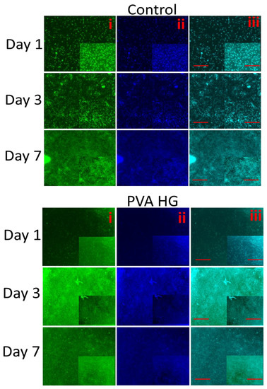 Fluorescence microscopic pictures of MSCs cultured on silver nanoparticle-loaded PVA hydrogels. PVA HG: Poly (vinyl alcohol) hydrogel; PVA-Ag HG: Poly (vinyl alcohol) hydrogel loaded with silver nanoparticles and control cells cultured without hydrogels. i—cells stained with FITC, ii—cells stained with DAPI, and iii—merged image. Images were captured at 4× and 10× magnification (insert). Scale bar: 200 µm and 100 µm (insert).