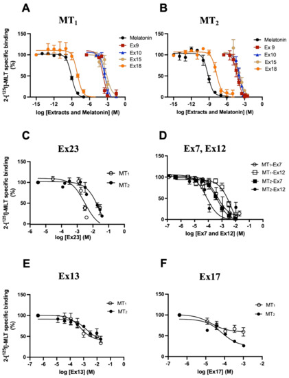 Competition of 2─[125I]─MLT binding by melatonin and plant extracts. Crude membrane preparations of HEK293 cells stably expressing MT1 (A) or MT2 (B) receptors were incubated with 100 pM of 2─[125I]-MLT and increasing concentrations of the indicated extracts. Competition curves of extracts with MT1 (C) and MT2 (D) selectivity (white symbols (MT1), black symbols (MT2)). Competition curves of extracts reaching a plateau at partial competition levels (E,F) (white symbols (MT1), black symbols (MT2)). The molarity of the active molecules present in extracts was estimated assuming an average molecular weight of 500 Da for small molecule constituents. Data are expressed as mean ± SEM of 3 independent experiments performed in duplicates. Curves were analysed using non-linear regression. Log EC50 values were compared for receptor selectivity for Ex23 (C) and Ex7 and Ex12 (D) via the extra sum-of-squares F test. p-values for differences in Log EC50 were p < 0.0001 for Ex23 (C); 0.0022 and 0.0001 for Ex7 and Ex12, respectively. The bottom of the curves was compared for the partial competition for Ex13 (E) and Ex17 (F). p-values for differences in bottom were 0.35 and 0.0012 for Ex13 and Ex17, respectively.