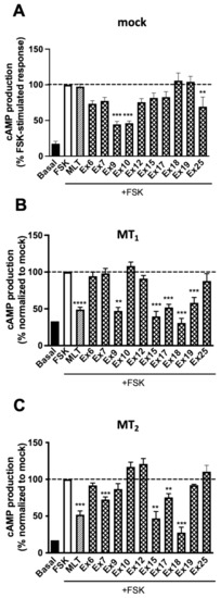 Effect of selected plant extracts on forskolin-stimulated cAMP production. Inhibitory effect of selected plant extracts on forskolin-stimulated cAMP production in HEK293 empty vector transfected cells (mock) (A) or cells stably expressing MT1 (B) or MT2 (C) receptors. Extracts were tested at a saturation concentration (3.2 × 10−4 M i.e., 0.16 mg/mL, except Ex18, which was tested at 8.69 × 10−8 M, equivalent to 0.005 mg/mL) and melatonin (1 µM). Data are normalized to maximal effect of forskolin-stimulated response (** p < 0.01; *** p < 0.001. (A) One-way ANOVA, n = 10; (B,C) two-tailed Student’s t-test, (** p = 0.014; *** p < 0.001; **** < 0.0001. n = 3. All experiments were performed in triplicates.