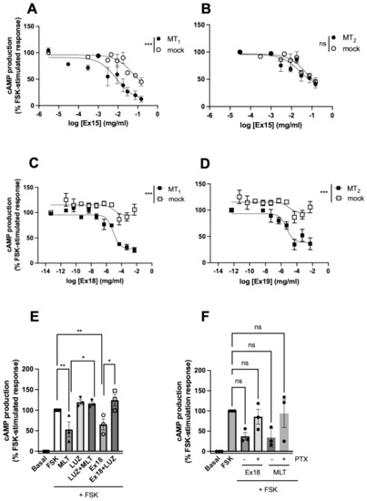 Effect of selected plant extracts on forskolin-stimulated cAMP production. Effect of increasing concentrations of Ex15 and 18 on HEK293 cells transfected with empty vector (mock), MT1 (A,C) or MT2 (B,D) receptors. Data are expressed as mean ± SEM of 3 experiments performed in triplicates. Curves were analysed using non-linear regression. The log EC50 and bottom values were compared for receptor-dependent effect using extra sum-of-squares F test. ** p < 0.001 and *** p < 0.0001. (E) Reversion of the effect of Pistacia vera in cAMP production by luzindole in HEK293 cells expressing MT2 receptor. Cells were stimulated with exogenous MLT (10 nM) and Ex18 (equivalent to 1 nM endogenous MLT in Ex18) in the presence or absence of luzindole (10 µM). Data are normalized to maximal effect of forskolin-stimulated response and represent the mean ± S.E.M. of 3 independent experiments performed in triplicates. One-way ANOVA * p < 0.05; ** p < 0.01. (F) Gi protein-dependent effect of Pistacia vera in HEK cells expressing MT2 receptors. Cells were pre-treated or not overnight with Pertussis toxin (PTX) (10 ng/mL) and stimulated with MLT or Ex18. Data are normalized to maximal effect of forskolin-stimulated response and are presented as mean ± S.E.M. of 3 experiments performed in triplicates. One-way ANOVA (* p < 0.05, ns, not significant).
