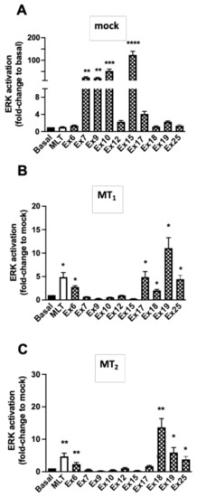 Effect of selected plant extracts on phospho-ERK levels. Detection of ERK1/2 phosphorylation in HEK293 empty vector transfected cells (mock) (A) or stably expressing MT1 (B) or MT2 (C) receptors. Extracts were tested at a saturation concentration (3.2 × 10−4 M i.e., 0.16 mg/mL, except Ex18, which was tested at 1.07 × 10−7 M, equivalent to 0.005 mg/mL) and MLT (1 µM). Data are expressed as mean ± SEM, n = 3–5). (A) (** p < 0.01; *** p < 0.0001; **** p < 0.0001; One-way ANOVA). (B) (* p = 0.02; two-tailed Student’s t-test); (C) (* p = 0.01; ** p = 0.004; two-tailed Student’s t-test).