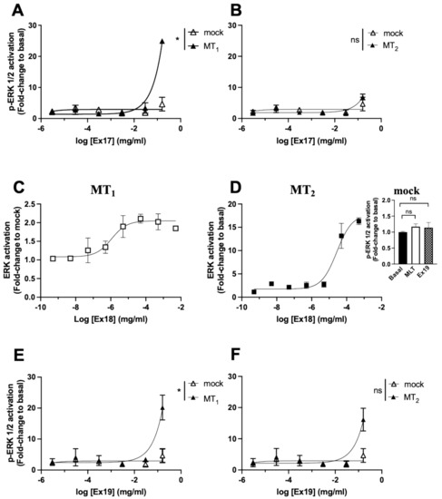 Concentration-dependence of the effect of selected plant extracts on phospho-ERK levels. Effect of increasing concentrations of Ex17, 18 and 19 on phospho-ERK1/2 levels in HEK293 empty vector transfected cells (mock) vs. HEK293 expressing MT1 (A,C,E) or MT2 receptors (B,D,F). Inset represents the effect of MLT and Ex18 at the maximum concentration on mock cells. Data represent the mean of three independent experiments performed in duplicates. (A,E) (* p = 0.02; ns: not significant; two-tailed Student’s t-test).