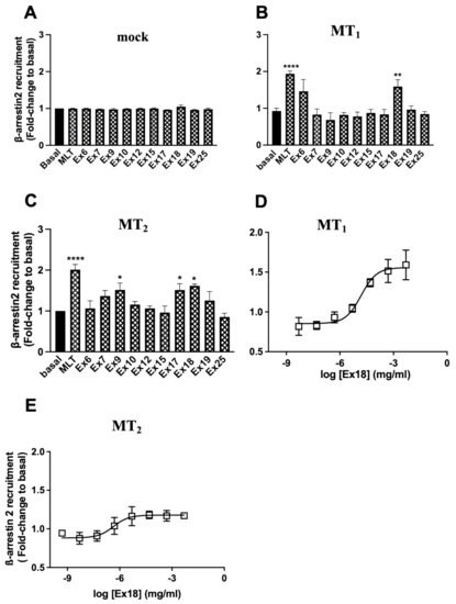 Effect of a saturating concentration of Ex9, 17 and 18 on β-arrestin2 recruitment assay. A single concentration of 3.2 × 10−4 M/0.16 mg/mL for extracts 9, 17 and 18; 1.07 × 10−7 M/0.005 mg/mL for Ex18 and MLT 1 µM was tested in HEK293 empty vector transfected cells (mock) (A) and HEK293 expressing MT1 (B) and MT2 (C) receptors. (D,E) show concentration–response curves of Ex18 on HEK293 cells expressing MT1 and MT2 receptors, respectively. Data are expressed as mean ± SEM of 3 and 5 experiments respectively performed in triplicates. (* p < 0.05; ** p < 0.01; **** p < 0.0001; One-way ANOVA).
