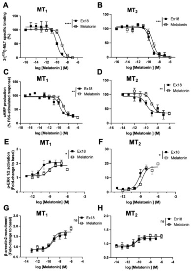 Replotting of experimental data obtained with Ex18 (Pistacia vera) based on the actual melatonin amount of Ex18 determined using HPLC-MS. (A,B) Competitive binding curves, concentration–response curve of the inhibition of cAMP production (C,D), ERK1/2 activation (E,F) and β-arrestin2 recruitment (G,H). Experiments with synthetic melatonin were run in parallel. Data are expressed as mean ± SEM, n = 3. Curves were analysed using non-linear regression. The log IC50 and EC50 values were compared between Ex18 and MLT via the extra sum-of-squares F test. p-values for log IC50 were **** p < 0.0001 (A), *** p = 0.0008 (B) and for log EC50 ** p = 0.002 (C), ** p = 0.009 (D), * p = 0.07 (E), * p = 0.02 (F). ns, not significant (G,H).