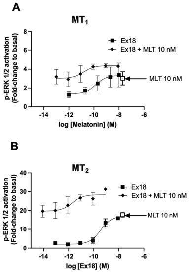 To further elaborate on the possibility of a potentiation of the melatonin response, the question has been raised on whether the effect of exogenous melatonin can be also potentiated by Ex18. This issue was addressed using the ERK1/2 assay, which showed the most robust potentiation effect of Ex18, and a concentration of 10 nM of melatonin. For both receptors, the effect of exogenous melatonin was amplified by increasing concentrations of Ex18 (Figure 8). For MT1, a left-shift of 1 log in pEC50 was observed, which, however, did not reach statistical significance (10.9 ± 0.76 M; n = 3) (p-value p = 0.45, paired t-test) (Figure 8A). In addition, for MT2, the pEC50 value was significantly left-shifted by three logs (12.6 ± 0.18 M; n = 3) (p-value ** p < 0.01, paired t-test) (Figure 8B) compared to the pEC50 value of Ex18 alone. Collectively, these results support the hypothesis of the presence of a potentiator of melatonin in Ex18.
