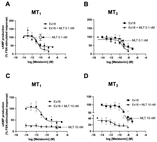 Next, the possibility of a potentiation of the melatonin response at the cAMP pathway was investigated at a saturating (10 nM) and a threshold (0.1 nM) melatonin concentration for both melatonin receptors (Figure 9). At 0.1 nM melatonin, no potentiating effect of Ex18 was observed for both melatonin receptors (Figure 9A,B). At 10 nM melatonin, Ex18 was unable to further improve the melatonin response at MT1 receptors (Figure 9C) but amplified the effect of melatonin on MT2 receptors with a left-shifted (1.7 log) pEC50, which, however, did not reach statistical significance (11.1 ± 0.76; n = 3) (p-value p = 0.17, paired t-test) compared to Ex18 alone (9.38 ± 0.78; n = 3) (Figure 9D). These results confirm the presence of a potentiator of melatonin in Ex18 that is also measurable at the cAMP pathway.