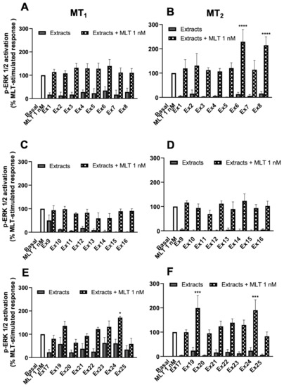 Potentiating effect of plant extracts on exogeneous melatonin on the ERK 1/2 pathway. Effect of 24 plant extracts tested at 0.0016 mg/mL alone or in the presence of melatonin (1 nM) is shown on p-ERK levels in HEK293 cells expressing MT1 (A,C,E) or MT2 (B,D,F) receptors. Data are presented as mean ± SEM, n = 3–5. * p < 0.05; *** p < 0.001; **** p < 0.0001. One-way ANOVA. All experiments were performed in duplicates.