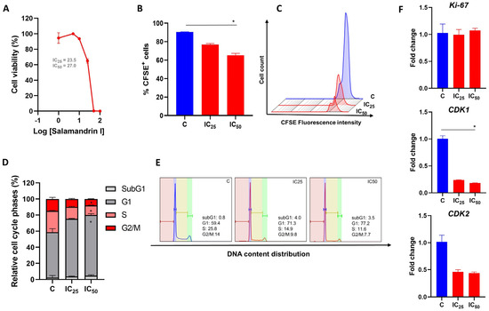 Antiproliferative effect of salamandrin-I. (A) HL-60 cells treated with increasing concentrations of salamandrin-I presented decreased viability, detected with an MTT assay. (B) Cell proliferation of HL-60 cells untreated (control, C) and treated with salamandrin-I at IC25 and IC50 doses. (C) Representative flow cytometry histogram showing CFSE+ in HL-60 cells treated with salamandrin-I at IC25 and IC50 doses. (D,E) Phases of the cell cycle, determined with flow cytometry, in C and HL-60 cells treated with salamandrin-I and exposed to IC25 and IC50 doses. (F) Expression of the genes Ki-67, CDK1, and CDK2 in C and HL-60 cells treated with salamandrin-I at IC25 and IC50 doses. Real-time PCRs were performed in technical duplicate, and the relative fold change was obtained with the 2−ΔΔCt method. Median Ct values obtained from untreated cell lines were used as a reference. Results are presented as means ± SEMs. * Asterisks indicate results that are statistically significant. * p < 0.05.