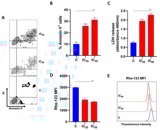 Effects of salamandrin-I on the viability and mitochondrial health of HL-60 cells. (A) Representative zebra plot showing the expressions of annexin-V and PI in C and HL-60 cells treated with salamandrin-I at IC25 and IC50 doses. (B) Annexin V+ HL-60 cells after treatment with salamandrin-I at IC25 and IC50 doses. (C) LDH releases in culture media for C and HL-60 cells treated with salamandrin-I at IC25 and IC50 doses. (D,E) Rhodamine 123 staining in C and HL-60 cells treated with salamandrin-I at IC25 and IC50 doses. Results are presented as means ± SEMs. Asterisks indicate results that are statistically significant. * p < 0.05.