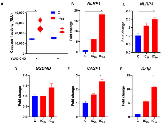 The PCR primers used to amplify the CASP1, CASP3, CASP8, P53, TP73, BAX, BAK, NLRP1, NLRP3, GSDMD, IL-1β, CDK1, CDK2, KI-67, and GAPDH genes are listed in Table 1. Real-time PCRs were performed using SYBR Green MasterMix (Thermo Scientific, Waltham, MA, USA) and a QuantStudio 1 Real-Time PCR System (Thermo Scientific, Waltham, MA, USA). All reactions were performed in technical duplicate, and the relative fold changes were obtained with the 2−ΔΔCt method [27]. Median Ct values obtained from untreated cell lines were used as a reference.