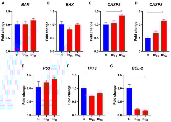 Gene expression analysis of selected transcripts. (A–G) Transcriptional levels of BAK, BAX, CASP3, CASP8, P53, TP73, and BCL-2. Real-time PCRs were performed in technical duplicate, and the relative fold change was obtained with the 2−ΔΔCt method. Median Ct values obtained from untreated cell lines (C) were used as a reference. Results are presented as means ± SEMs. Asterisks indicate results that are statistically significant. * p < 0.05.