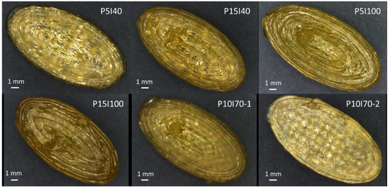 Light microscope images of the tablets from experiments P5I40, P15I40, P5I100, P15I100, P10I70-1, and P10I70-2.