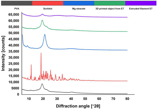 The XRPD patterns of the excipients, the crushed filaments, and the printed discs from a successful formulation (E7) were analyzed and compared. E7 was chosen in order to obtain information about all the excipients that were varied in stage 2 (PVA 2, sorbitol, and magnesium stearate). The diffractograms obtained by XRPD analysis are presented in Figure 4. The XRPD pattern of pure PVA showed a broad peak and a halo of 2θ = 19°–24°, which was in accordance with the literature data and indicated the semi-crystalline nature of the polymer [14]. The pure sorbitol showed two distinct crystalline peaks at 2θ = 11.8° and 18.5°, as well as multiple smaller peaks in the region of 2θ = 20°–34°. The pure magnesium stearate showed a broad peak at 2θ = 21°, but its concentration in the formulation was insufficient to be detected in the diffractograms of the extrudates and the printed discs. The XRPD patterns of the extrudates revealed a broad halo around 2θ = 30°, which indicated that part of the plasticizer was still in a crystalline state. The results for the printed discs did not show a halo in this area and were similar to the patterns of the pure polymer, indicating that the sorbitol was in an amorphous state. The latter confirmed that the plasticizer could be molecularly dispersed in a PVA polymer matrix. Potentially, the presence of crystalline sorbitol in the filaments could be avoided by better mixing during the extrusion process, but this hypothesis needs to be confirmed.