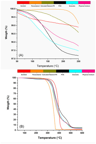 In Figure 5B can be seen that PVA started decomposing around 250 °C, which was observed in other studies [21,32]. Paracetamol showed no degradation until around 230 °C. Sorbitol was thermally stable until 300 °C. Overall, TGA curves for all samples showed that they were stable at the extrusion and the printing temperatures (200 °C and 185 °C, respectively).