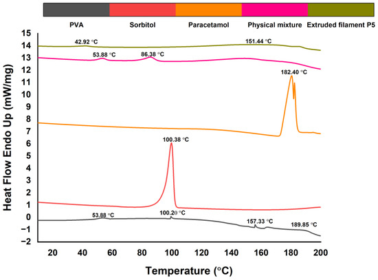 The DSC thermograms are presented in Figure 6. Paracetamol exhibited an endothermal peak at 184.40 °C, indicating the crystalline state of the drug. Sorbitol also showed a distinctive endothermic peak at 100.38 °C. The peak at 53.88 in the PVA endotherm depicted its Tg, while the one at 100.20 °C could be attributed to the water evaporation [19]. Two endothermic peaks indicating the Tm were observed instead of one at 157.33 °C and 189.85 °C. As the PVA used in this study was with a MW in the range between 31,000 and 50,000, these peaks could represent the melting temperatures of the different fractions of the polymer. The broad endotherm also indicated the semi-crystalline nature of the polymer [14], which was confirmed by the XRPD analysis. Expectedly, the physical mixture showed the same endothermic peak at 53.80 °C, indicating that the Tg of the polymer did not change by mere physical mixing with the plasticizer. The second endotherm at 86.38 could potentially be attributed to water evaporation. On the other hand, the extrudates (P5) demonstrated a lower Tg (42.92 °C) and a broader endotherm Tm (151.44 °C), indicating that the melting of PVA and sorbitol during the extrusion resulted in a molecular interaction between both substances. The decrease of Tg proved that in the concentration used, sorbitol had a significant plasticizing effect on the polymer, which was attributed to the formation of hydrogen bonds between the OH-groups of both compounds and a subsequent increase of the distance between the polymer chains [19]. The lower Tg could be the reason for the lower printing temperature (185 °C) compared to the extrusion temperature (200 °C). The absence of the characteristic endotherm peak of paracetamol suggested that the API was included as a solid dispersion within the polymer extrudate.