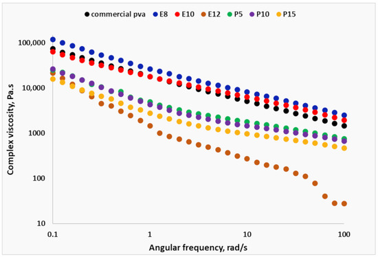 The complex viscosity (η*) of the formulations E8, E10, E12, P5, P10, and P15 and the commercial PVA filament was determined as a function of the angular frequency (ω). The rheological analysis was conducted using a rotational rheometer AR-G2, TA Instruments, New Castle, DE, USA. The electrical heating parallel plate geometry with crosshatched plates of 25 mm diameter at a fixed gap of 1 mm between the plates was used. Prior to testing, the material was heated up to 170 °C and pressed into a 22 mm slug using Carver hydraulic press (Carver Inc., Wabash, IN, USA). Preliminary strain sweep tests were carried out for all samples in the strain (γ) range of 0.01–100% at a fixed frequency of 1 Hz to determine the linear viscoelastic region (LVR) and to choose the strain amplitude for the consecutive frequency sweep measurements. An oscillation frequency sweep study was conducted by varying the angular frequency from 0.1 to 100 rad/s at a fixed temperature of 185 °C in order to measure the complex viscosity. The complex viscosity of the commercial PVA filament with proven printability was used as a reference.