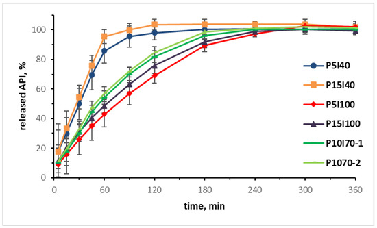 The dissolution profiles obtained from the in vitro release study are presented in Figure 8. Only extrudate P15I40 complied with the requirement that at least 75% of the active substance should be dissolved within 45 min [35]. The results showed that the 3D-printed tablets with higher infill percentages were characterized by a slower drug release. Both formulations with 40% infill generally exhibited a typical immediate-release profile. The tablets with 100% infill were more suitable for a prolonged release, as P5I100 released less than 75% paracetamol after 120 min. This could be explained by the fact that in tablets with lower infill larger surface of the polymer matrix was in contact with the dissolution media and, as also pointed out in previous studies [14,36], the drug release of 3D-printed PVA matrix tablets was defined by a surface erosion mechanism.