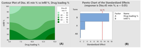 The two input variables in this study were the drug loading of the extrudates and the infill percentage of the tablets, while the percentage of the released drug after 45 min was set as a response variable. As depicted in the Pareto chart in Figure 9B, only the infill bar crossed the dotted vertical line (positioned at α = 0.05), which indicated that this variable had a significant standardized effect at a 95% confidence level. Analysis of variance (ANOVA) also confirmed that only the infill had a significant effect (p < 0.05) on the drug release. The determination coefficient R2 was found to be 0.9967, which implied a good prediction accuracy of the given model.