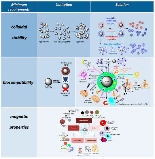 Over time, based on a deeper understanding of the action mechanism of bio-MNPs in biomedical applications, some ideal properties, considered minimum requirements for the functionalization of MNPs, were proposed for higher performance of these materials in practical nano-bio applications (Figure 2).