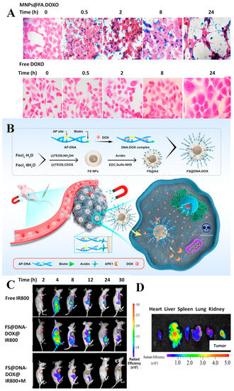 The carrier consists of Fe3O4@SiO2 NPs and a specially designed AP-DNA strand that can be hydrolyzed by APE1. DOX was loaded onto the AP-DNA to form the theragnostic nanosystem (FS@DNA-DOX). The distribution of FS@DNA-DOX NPs was evaluated by in vivo fluorescence imaging and it was observed that after magnetic attraction near the tumor, the fluorescence intensity in the tumor location was significantly higher than that in other tissues, but without magnetic attraction, a strong distribution in the other organs was observed (Figure 3C). The fluorescence intensity per unit area in the tumor area was significantly higher than that in other organs after treatment with NPs with magnetism (Figure 3D) [123]. Some cancer treatment regimens involve drug combinations in order to enhance the treatment’s effectiveness. Thus, the encapsulation of different drugs in DDS is of interest for clinical practice. A novel approach, based on a core/double shells magnetic-luminescent nanomaterial was reported as nanocarrier for both MTX and DOX for simultaneous administration in breast cancer therapy. The encapsulation of the two drugs has been demonstrated with good efficiency, and a controlled pH-dependent drug release was observed. The encapsulation system has proven effective in cell line tests, being able to distinguish between normal and cancer tissues and cytotoxicity studies against MCF-7 cells demonstrated superior tumor inhibition compared to the free drugs [150].