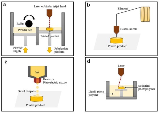 Schematic working process of 3D printing techniques, including (a) powder-based 3D printing, (b) extrusion-based 3D printer, (c) inkjet-based 3D printing, and (d) laser-based 3D printing.