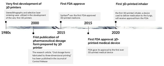 A significant amount of research and development has since been conducted in this area, and many pharmaceutical companies have started to explore the use of 3D printing for a variety of applications, including drug dosage forms, drug delivery devices, and medical devices and implants []. The following is a timeline highlighting several significant turning points in the evolution of 3D printing in the pharmaceutical industry (Figure 2). Thus, this technology will continue to evolve and be used in new and innovative ways in the coming years.
