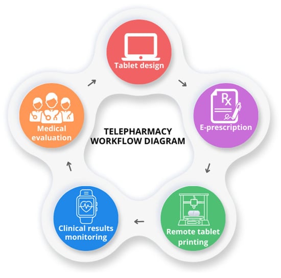 The delivery of pharmacy services at a distance can be accomplished using telecommunication and information technologies, such as videoconferencing and electronic health records. This practice is known as “telepharmacy” []. Telepharmacy refers to the remote provision of pharmacy services, often in underserved areas where access to healthcare facilities is limited. Telepharmacy benefits patients by enabling remote pharmacies to overcome logistical challenges and improve patient care. Three-dimensional printing technology may have the potential to be utilized in telepharmacy in various approaches, as shown in Figure 5. Three-dimensional printing can be used to prepare personalized medication for patients who are located at a distance from one another. Adjustments to the dosage of the medication can be made in accordance with the clinical results, such as changes in the patient’s heart rate, blood pressure, and blood sugar level. These clinical outcomes can be remotely monitored by wearable devices, such as sensors or patches [,]. Patients with chronic disease conditions that are stable and under their control can greatly benefit from this concept. This can give patients the convenience to reduce their travel, which also helps to limit the number of people in the hospital []. In the event of a natural disaster or other emergency that disrupts supply chains, 3D printers can be used to produce essential medications and medical supplies on-site, ensuring continued access to healthcare.