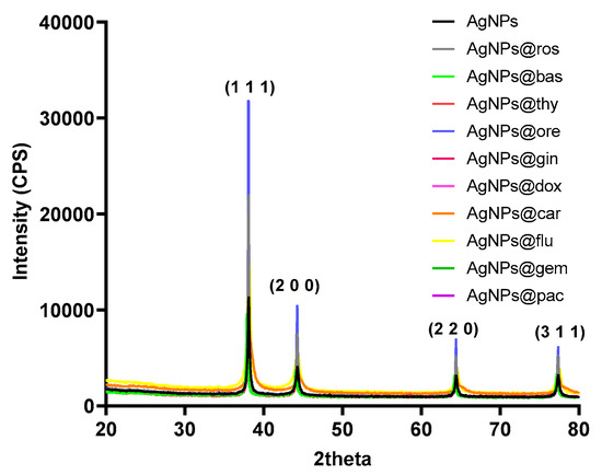 The XRD patterns of the AgNPs can be observed in Figure 1. Four diffracted intensities in the range 20°–80° were measured. The XRD patterns confirm the cubic crystal structure of the AgNPs. Specific peaks were identified at 2θ values of 38.45°, 46.35°, 64.75°, and 78.05°, which correspond to the (1 1 1), (2 0 0), (2 2 0), and (3 1 1) diffraction plans of the AgNP crystals (JCPDS (00-001-1167) [40].