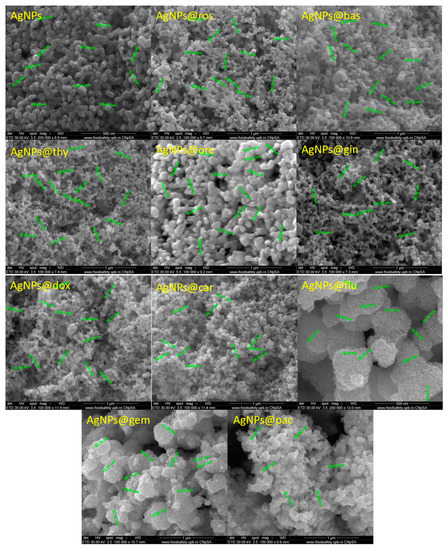The SEM micrographs (Figure 2) show the nanometric size of the AgNPs. The particles have a quasi-spherical shape, with diameters varying from 20 to 60 nm. In addition, it can be observed that the AgNPs functionalized with EOs have higher diameters than those functionalized with cytostatic drugs. Most likely, this phenomenon is due to the complexity of the EOs that contain hundreds of compounds, while cytotstatic drugs are composed of single molecules.