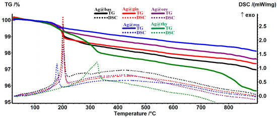 As many components are similar in the EOs, their thermal behaviors are also similar (Figure 4). The AgNPs loaded with EOs present a mass loss step at approximately 190–210 °C for Ag@bas, Ag@gin, and Ag@ore; between 170 and 210 °C for Ag@ros; and between 210 and 360 °C for Ag@thy. These mass loss steps correspond to the oxidation of the most susceptible components from the EOs. For the Ag@bas, Ag@gin, and Ag@ore samples, the exothermic effect is consistent at ~202 °C, indicating the same class of compounds that are oxidized. The burning of the residual carbonaceous mass takes place at higher temperatures. The silver-white residual mass values are presented in Table 3, together with the estimated EOs loads.