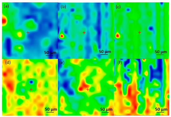 Infrared micrographs of PHBV/AgNPs obtained based on the intensity of C-H for (a) drop-cast and coatings at laser fluences of (b) 200 mJ/cm2; (c) 300 mJ/cm2; (d) 400 mJ/cm2; (e) 500 mJ/cm2; and (f) 600 mJ/cm2.