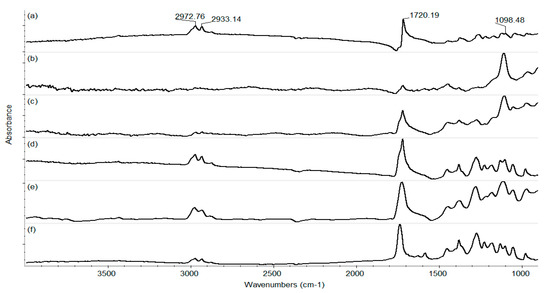 IR spectra of PHBV/AgNPs for (a) drop-cast and coatings at laser fluences of (b) 200 mJ/cm2; (c) 300 mJ/cm2; (d) 400 mJ/cm2; (e) 500 mJ/cm2; and (f) 600 mJ/cm2.