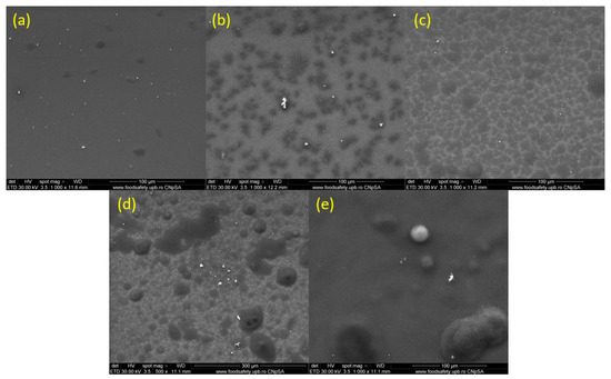 SEM images of PHVB/AgNPs coatings at 1000× (a–e), obtained at laser fluences of (a) 200 mJ/cm2; (b) 300 mJ/cm2; (c) 400 mJ/cm2; (d) 500 mJ/cm2; and (e) 600 mJ/cm2.