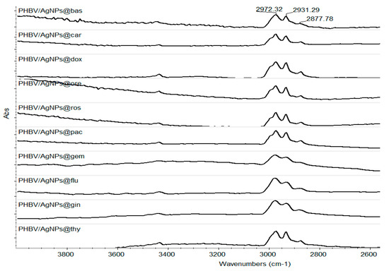 Taking into consideration the physical–chemical results obtained for the control coatings, the laser fluence of 400 mJ/cm2 was considered the optimum value to continue our investigations. Thus, Figure 9 presents the IR spectra of all composite coatings. One can observe, as already stated, that there is no degradation of the C-H group. All samples have the complete absorbance characteristics of this group.