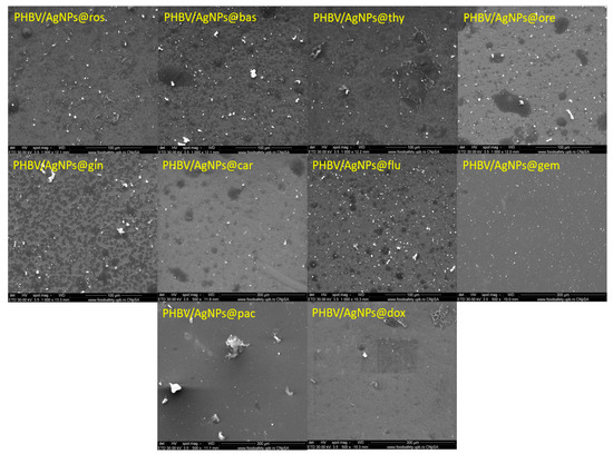 SEM images of AgNPs functionalized with different cytostatic drugs and essential oils.