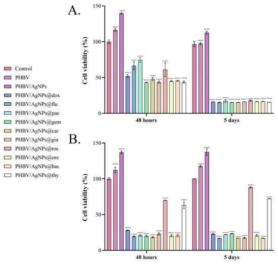 Graphical representation of cell viability of (A) MCF7 tumor cells and (B) VERO cells after 48 h and 5 days of contact with uncoated samples (control) and PHBV, PHBV/AgNPs, PHBV/AgNPs@dox, PHBV/AgNPs@flu, PHBV/AgNPs@pac, PHBV/AgNPs@gem, PHBV/AgNPs@car, PHBV/AgNPs@gin, PHBV/AgNPs@ros, PHBV/AgNPs@ore, PHBV/AgNPs@bas, and PHBV/AgNPs@thy coatings as revealed by the MTT assay. The represented data are the mean values of three independent experiments ± S.D. Statistical significance: **** p < 0.0001 sample vs. control.