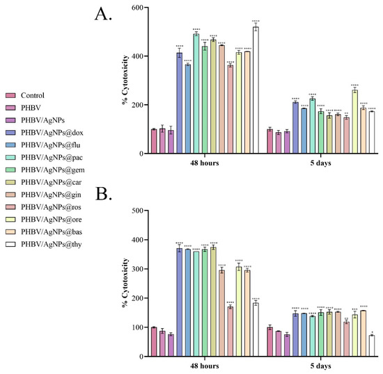 Graphical representation of uncoated samples (control) and PHBV, PHBV/AgNPs, PHBV/AgNPs@dox, PHBV/AgNPs@flu, PHBV/AgNPs@pac, AgNP PHBV/AgNPs@gem, PHBV/AgNPs@car, PHBV/AgNPs@gin, PHBV/AgNPs@ros, PHBV/AgNPs@ore, PHBV/AgNPs@bas, and PHBV/AgNPs@thy coating cytotoxicity as revealed by the LDH leakage levels quantified in culture media samples harvested from (A) MCF7 tumor cells and (B) VERO cells after 48 h and 5 days with the experimental samples. The represented data are the mean values of three independent experiments ± S.D. Statistical significance: * p < 0.05; ** p < 0.01; *** p < 0.001; **** p < 0.0001 sample vs. control.