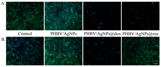 Fluorescence micrographs revealing (A) MCF7 cells and (B) VERO cells cytoskeleton after 5 days of contact with a reference sample, pristine PHBV/AgNPs, PHBV/AgNPs@dox, and PHBV/AgNPs@ros. Scale bare: 100 μm (green—actin filaments labeled with FITC-phalloidin; blue—cell nuclei stained with DAPI).