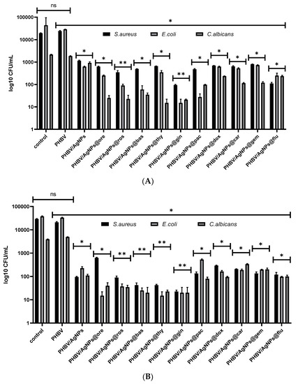 Graphical representation of log10 CFU/mL values obtained for tested microbial strains, expressing viability of bacteria incubated as 0.5 McFarland suspensions in PBS on the obtained coatings for 2 h (A) and 24 h (B). * p < 0.05; ** p < 0.001 by comparing biofilm formation on PHVB control and each AgNPs coatings, ns—not significant.