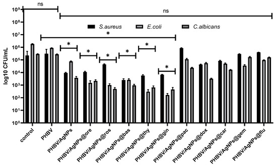 Graphic representation of log10 CFU/mL values obtained for the tested microbial strains, expressing biofilm-embedded cells developed on control and AgNPs coatings for 24 h of incubation. * p < 0.05; by comparing biofilm formation on PHVB control and each AgNPs coatings; ns—not significant.
