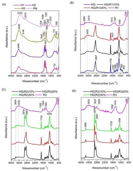 ATR-FTIR spectra of the as-prepared (before calcinations) pristine LDHs: H1, H2, and H3 and the dried phytocomplex Rfs (A), the spectra of sample R1 containing RfL phytocomplex immobilized by reconstruction in H1 matrix and the hydrogel-encapsulated HG(R1) samples with different concentrations of R1—10% and20% compared to the dried HG (B); the spectra of sample R2 containing RfL phytocomplex immobilized by reconstruction in H2 matrix and the hydrogel-encapsulated HG(R2) samples with different concentrations of R2—10%, 20%, and 30% (C); the spectra of the sample R3 containing RfL phytocomplex immobilized by reconstruction in H3 matrix and the hydrogel-encapsulated HG(R3) samples with different concentrations of R3 (10%, 20%, and 30%) (D).