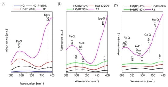 As it may be seen in Figure 3A, the neat hydrogel does no present absorption bands in the investigated domain. For all the hydrogel-encapsulated samples the bands are very weak due to the low amount of incorporated LDH-RfL. For the sample R1 which contained only Mg and Fe in the LDH matrix, the positions of the characteristic absorption maxima after its encapsulation in the hydrogel were shifted to lower wavenumbers only at the lowest concentration of R1, suggesting that the new bonds created between R1 and the polymer were very weak. The incorporation of the samples R2 and R3 into the hydrogel leads to the modification of the positions of the maxima characteristic to the neat LDH-RfL samples (Figure 3A,B), suggesting that Al-O and Fe-O bonds are formed with the polyether groups of the polymer.