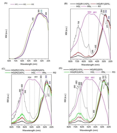 DR-UV-Vis spectra of the as-prepared (before calcinations) pristine LDHs: H1, H2, and H3 (A), the spectra of sample R1 containing RfL phytoextract immobilized by reconstruction in H1 matrix and the hydrogel-encapsulated HG(R1) samples with different concentrations of R1—10% and 20% compared to the dried RfL phytoextract (Rfs) and dried HG (B); the spectra of sample R2 containing RfL phytoextract immobilized by reconstruction in H2 matrix and the hydrogel-encapsulated HG(R2) samples with different concentrations of R2—10%, 20%, and 30% compared toRfL and dried HG (C); the spectra of the sample R3 containing RfL phytoextract immobilized by reconstruction in H3 matrix and the hydrogel-encapsulated HG(R3) samples with different concentrations of R3—10%, 20%, and 30% compared to Rfs and dried HG (D).