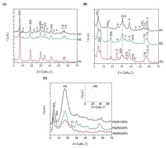 XRD patterns of the pristine LDHs (A), the reconstructed samples containing RfL phytoextract (B) and the hydrogel-encapsulated RfL phytoextract immobilized in LDH matrix (C); inset in (C)—the XRD pattern of the neat hydrogel (HG); abbreviations: (C)—calcite; G—goethite; H—hematite; Mgh—maghemite.
