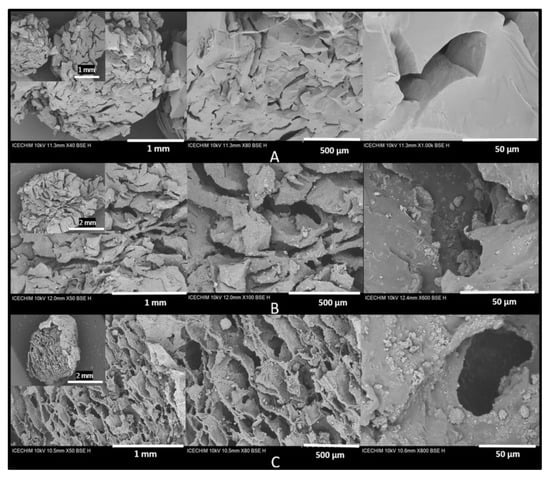 SEM micrographs of lyophilized composites HG. (A) control HG; (B) composite HG with LDHs—HG(H1)20%; (C) and composite HG with RfL Phytocomplex immobilized in the LDHs matrix- HG(R1)20%.