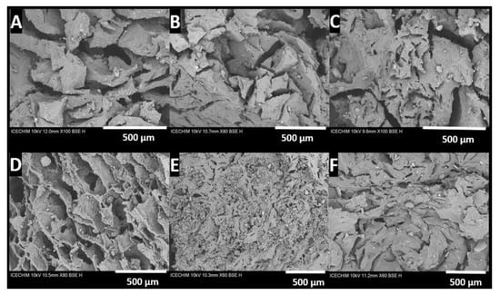 SEM micrographs of lyophilized composite HGs: (A–C) composites with LDHs without phytoextract, namely: (A) HG(H1)20%, (B) HG(H2)30%, (C) HG(H3)30% and HG composites with RfL phytoextract immobilized in the LDHs matrix, namely: (D) HG(R1)20%, (E) HG(R2)30%, and (F) HG(R3)30%.
